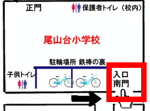 - 自転車でお越しの場合は、南門から入った鉄棒の前に駐輪してください。道路上や門の前への駐輪はご遠慮ください。